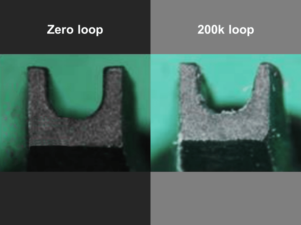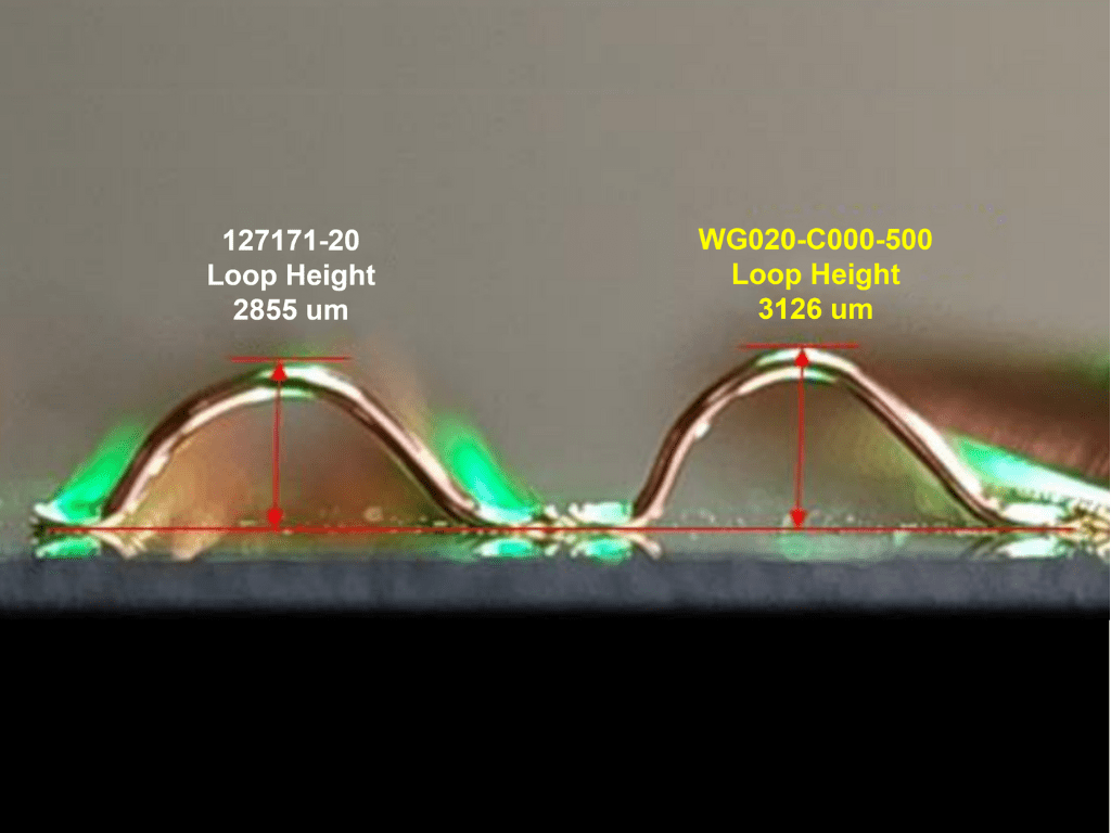CuGxは10万回(100K)のループ後でも摩耗やたわみを最小限に抑え、安定したループ形状を実現します。この持続的な安定性により、長期間の生産においても各ボンド精度が損なわれません。頻繁なツール交換を必要とせず、常に信頼性の高いルーピング品質を提供します。